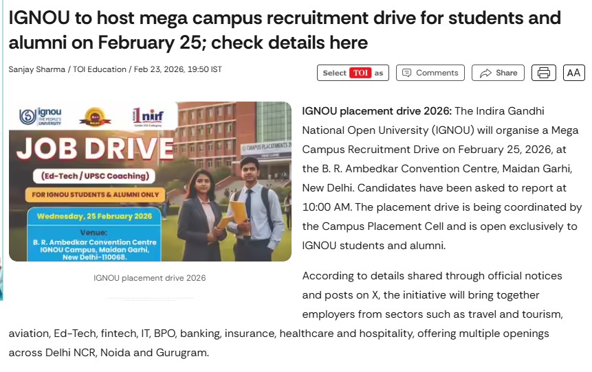 IGNOU to host mega campus Recruitment Drive for Students and Alumni on 25 February 2026 at IGNOU New Delhi